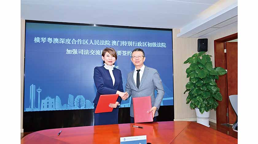 【特訊】昨日下午,澳門特別行政區第一審法院姚頴珊院長和橫琴粵澳深度合作區人民法院陳曉軍院長分別代表澳門特別行政區初級法院和橫琴粵澳深度合作區人民法院,在橫琴粵澳深度合作區人民法院簽署了《澳門特別行政區初級法院 橫琴粵澳深度合作區人民法院加強司法交流協作紀要》(見圖)。紀要包含七方面的內容:一、不斷鞏固和深化兩地法院互訪交流機制;二、雙方輪流舉辦各類專業研討活動;三、持續開展資訊交流;四、認真執行兩地司法協助安排;五、相互分享兩地司法改革及司法領域資訊技術應用的經驗;六、共同研究和推動為粵港澳大灣區和橫琴粵澳深度合作區建設提供司法服務和保障的相關事項;七、雙方各指定一名連絡人保持溝通與聯絡。