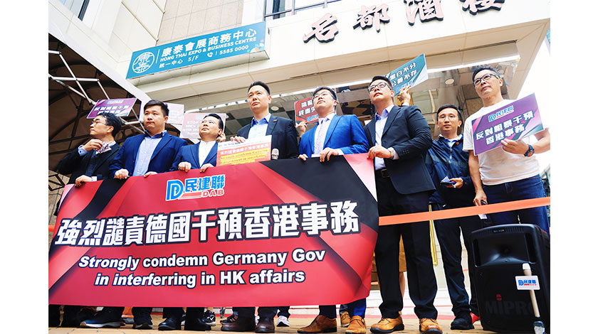 香港最大政治團體民主建港協進聯盟(簡稱「民建聯」)當天在德國駐港總領事館外集會,抗議法國和德國外交部頒發所謂「法德人權法治獎」予被控涉嫌幹犯香港國安法罪行的鄒幸彤。