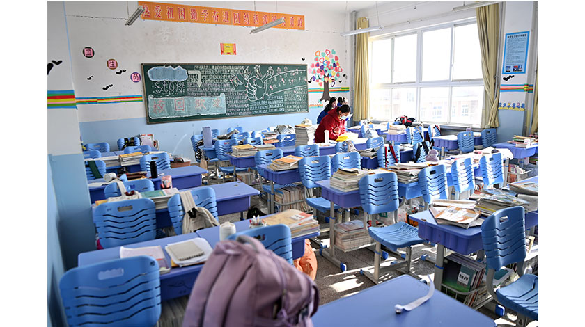 22日,甘肅積石山6.2級地震發生後第四天,積石山縣4900余名高中學生迎來線上復課。圖為積石山縣民族中學學生從學校取教材等物品回家準備線上課程。 中新社