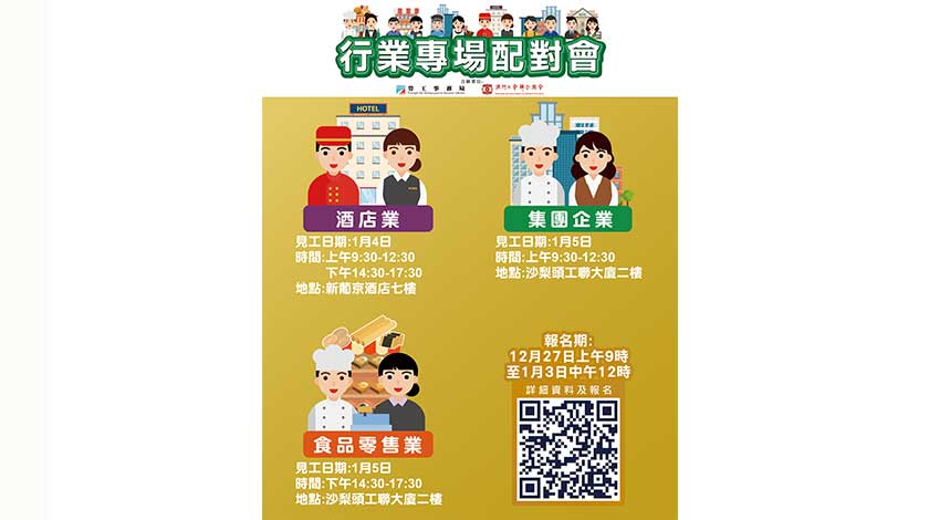 1月4日全日舉辦酒店業配對會,提供51個職位空缺,涉及廚師(中餐 或西餐)、餐飲服務員及穿梭巴士服務專員。配對會在澳門新葡京酒店7樓舉行。