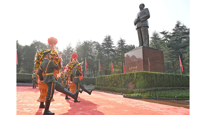 12月27日,湖南省委、省政府在湖南韶山隆重舉行向毛澤東同志銅像敬獻花籃儀式,紀念毛澤東同志誕辰130周年,深切緬懷毛澤東同志的豐功偉績。圖為社會各界人士向毛澤東同志銅像敬獻花籃。 中新社