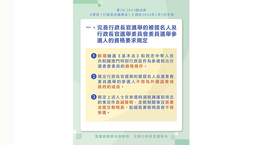 在完善行政長官選舉的被提名人及行政長官選舉委員會委員選舉參選人的資格要求規定方面,上述法律新增擁護《澳門特別行政區基本法》和效忠中華人民共和國澳門特別行政區作為參選和出任選委會委員的資格條件,規定行政長官選舉的被提名人及選委會委員選舉的參選人不得為外國議會或政府的成員,並規定上述人士在參選時須就擁護和效忠事宜作真誠聲明,須簽署並提交聲明書,拒絕簽署聲明書者不得參選。