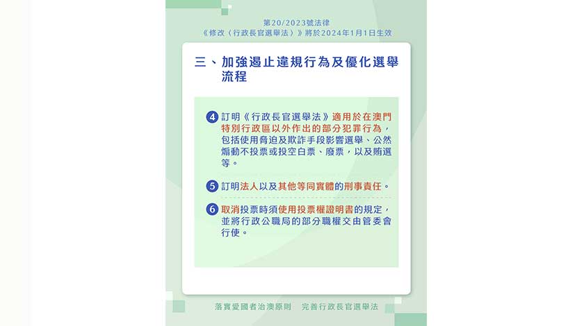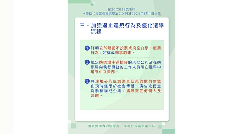 同時,法律加強遏止違規行為及優化選舉流程,訂明公然煽動不投票或投空白票、廢票行為,將構成刑事犯罪;訂明《行政長官選舉法》適用於在澳門特別行政區以外作出的部分犯罪行為,包括使用脅迫及欺詐手段影響選舉、公然煽動不投票或投空白票、廢票,以及賄選等;將違規公佈民意調查結果的處罰對象由現時僅限於社會傳播、廣告或民意測驗機構或企業,擴展至任何個人及實體;訂明法人及其他等同實體的刑事責任。