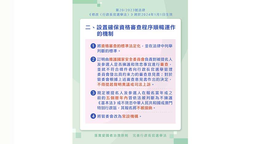 此外,法律設置確保資格審查程序順暢運作的機制,將資格審查的標準法定化,列舉相關判斷標準,訂明由維護國家安全委員會負責就被提名人及參選人是否擁護和效忠事宜進行審查,並就不符合條件者向行政長官選舉管理委員會發出具約束力的審查意見書;對於管委會根據上述審查意見書作出的決定,不得提起聲明異議或司法上訴。
