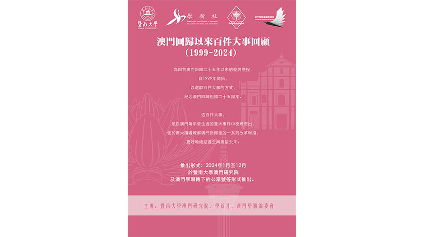 這百件大事,是自澳門1999年回歸以來,每年發生過的重大事件中梳理而出,便於廣大讀者瞭解澳門回歸後的一系列改革舉措,更好地總結過去與展望未來。這些大事,現正於2024年1月至12月於暨南大學澳門研究院及澳門學聯轄下的公眾號等形式推出。