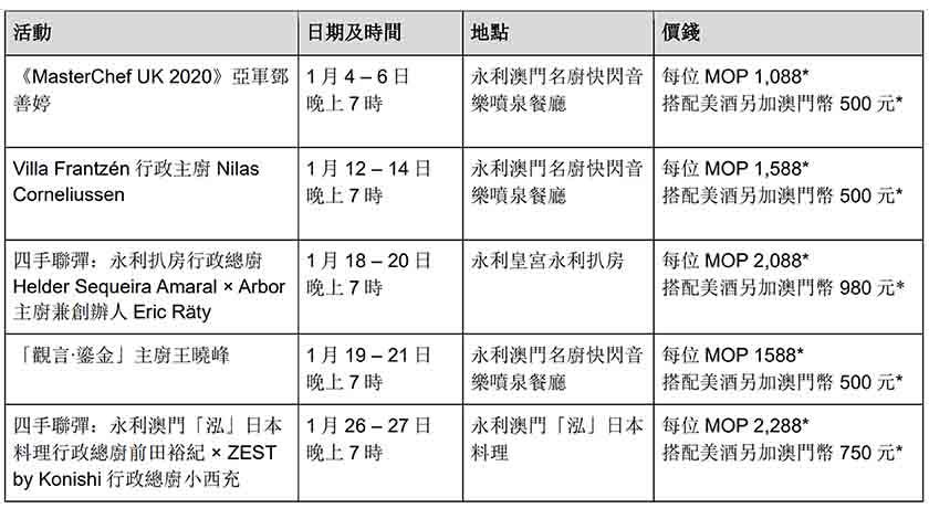 【特訊】為迎接新的一年,永利誠邀一眾星級名廚於一月前來呈獻精彩廚藝盛宴。三位特邀名廚將在永利澳門「名廚快閃音樂噴泉餐廳」亮相,來自澳門的《Master Chef UK2020》亞軍鄧善婷將把英式風情融入澳門特色菜,Villa Frantzén餐廳行政主廚Nilas Corneliussen將帶來結合泰式風味的北歐料理,而杭州「觀言∙鎏金」主廚王曉峰將呈獻極具地方風味的潮汕美饌。