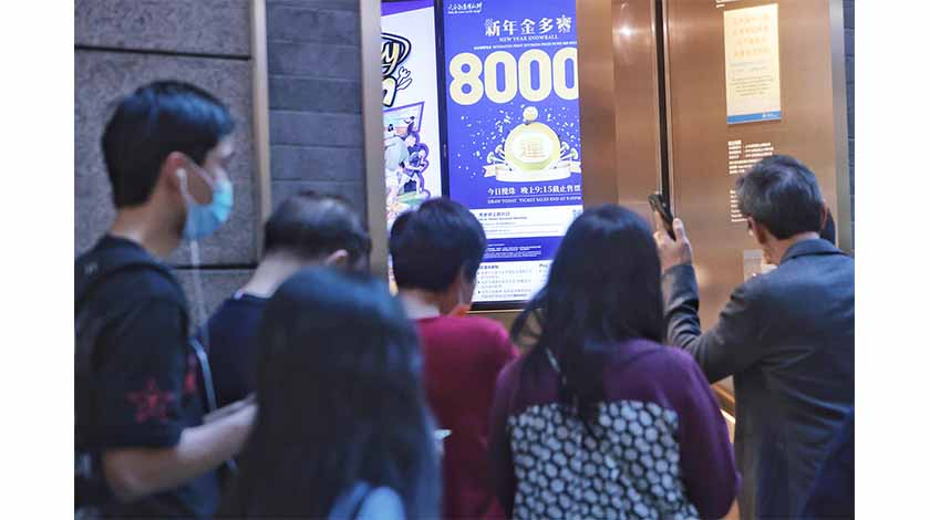 香港新年金多寶8000萬攪珠,投注站大排長龍。1月3日,香港新年金多寶將在晚上9時30分攪珠,若以10元投注並一注獨中,將有機會獲得高達8000萬港元的獎金。圖為中環士丹利街投注站,大批市民排隊投注。(香港中通社)
