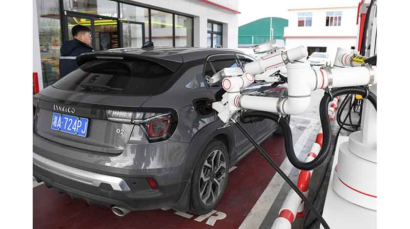 1月4日,加油機器人為汽車加油。近期,長沙一加油站推出的加油機器人服務吸引了不少客人前來光顧。在APP預約下單後,駕駛員祗需要將車輛停至指定區域,加油機器人搭載的機械手臂就會通過視覺識別技術定位車輛油箱蓋,並自主完成開蓋、加油、關蓋等一系列操作,實現無人全自動加油。 中新社