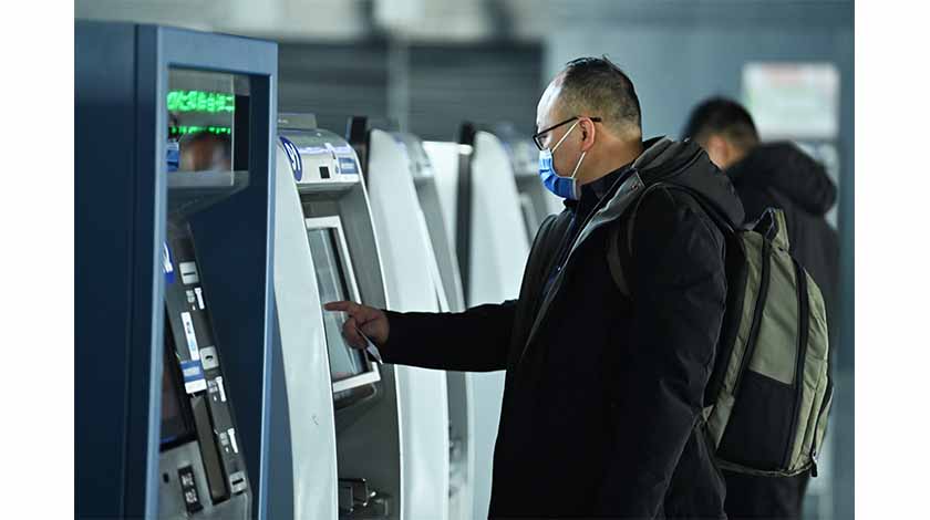 1月12日,甘肅省蘭州市,旅客在蘭州西站大廳自動售票機購票、取票。當日,2024年春運首日火車票開售。 中新社