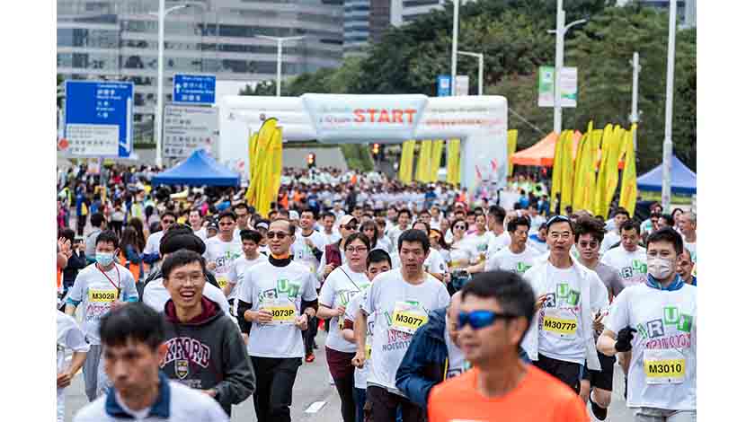 1月14日,東華三院“奔向共融”——香港賽馬會特殊馬拉松2024(iRun)活動在香港中環海濱舉行,圖為眾多活動參與者起跑出發(中新社)