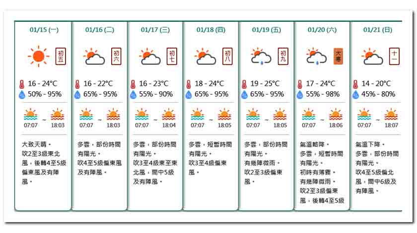 氣象局七日天氣預報顯示,今日大致天晴,氣溫十六至廿四度;明(16)日多雲,部分時間有陽光,氣溫十六至廿二度;周三(17日)多雲,部分時間有陽光,氣溫十六至廿三度;周四(18日)多雲,短暫時間有陽光,氣溫十八至廿四度。周五(19日)多雲,部分時間有陽光,有幾陣微雨,氣溫十九至廿五度;周六(20日)(大寒)氣溫略降,多雲,短暫時間有陽光,初時有薄霧,有幾陣微雨,氣溫十七至廿四度;周日(21日)氣溫下降,多雲,部分時間有陽光,氣溫十四至廿度。
