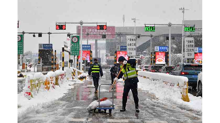 1月22日,在湖南省長沙市,工作人員在長張高速長沙西收費站拋撒融雪劑。受寒潮天氣影響,我國多地迎來降溫降雪。新華社