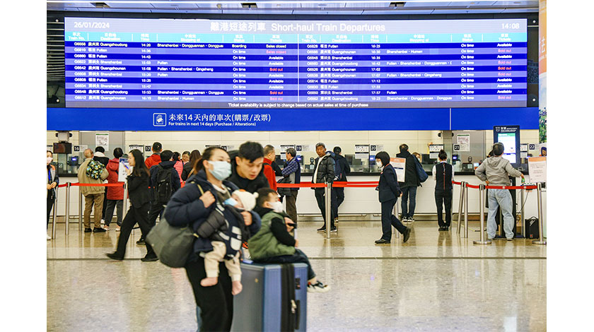 2024年春運啟幕。1月26日,2024年春運首日,香港高鐵西九龍站客流順暢。圖為大批旅客於票務大堂處理車票事務。(香港中通社)