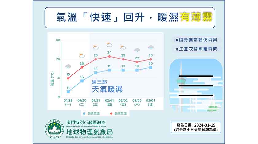 隨著本澳的氣溫進一步回升,本周中後期的天氣將較為和暖潮濕,早晚有薄霧,有幾陣微雨。
