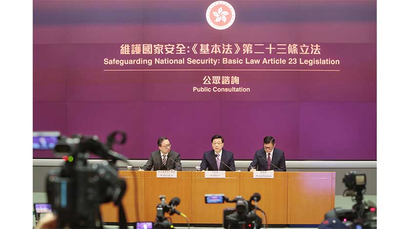 李家超介紹,23條立法將新增“境外干預罪”,禁止任何人配合外國勢力干預香港選舉、立法及司法機關等。另外亦會在不誠實取用電腦的基礎上引入新罪行,針對透過電子系統危害國安的行為。