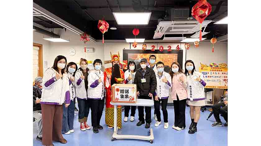 澳電愛心大使由明暉負責人帶領參觀中心設施及日常運作後,來到活動室與長者唱歌玩遊戲,以音樂及互動遊戲瞬間破冰;澳電同事裝扮的龍年財神更率領愛心大使走入病房探訪卧床長者,送上手寫揮春祝願大家身體健康、精神爽利。