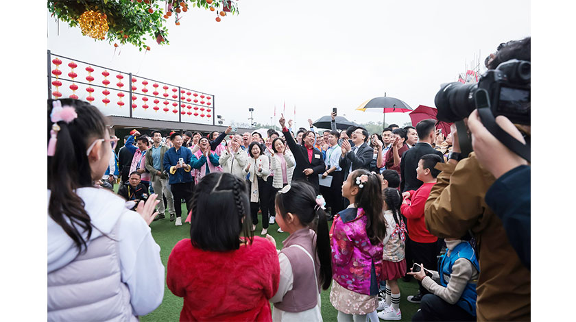 “特首!新年快樂!”盆菜宴後,李家超到林村許願樹下,一眾小孩看到特首都很開心,齊聲向特首拜年。李家超也祝他們身體健康、長高長大、學業進步,囑咐學生努力讀書、孝順父母。隨後他將一個橘子綁著的寶牒拋向高高的樹梢,現場歡呼聲陣陣。