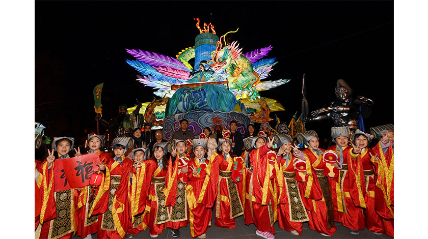 8日晚 “2024武侯祠成都大廟會”亮燈開廟。本屆大廟會以“三國元宇宙,潮玩成都年”為主題,廟會期間將舉辦國潮風格的三國主題燈展、“義薄雲天——關公主題精品文物展”以及創新多彩的文藝演出、熱鬧的諸葛創意市集,為民眾呈上獨特的成都年味。圖為小喜神在大廟會上送祝福。 中新社