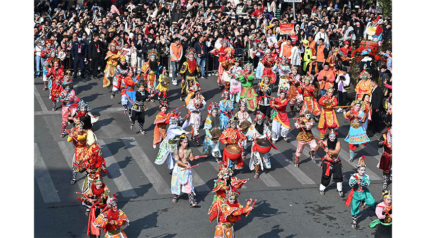 2月14日,正月初五,“中華英歌•舞動汕頭”2024年春節英歌舞展演巡遊活動在廣東汕頭潮陽區文光塔廣場舉行,15支英歌隊、近千名“舞者”獻上“年味”十足的表演,吸引市民遊客觀看。 中新社