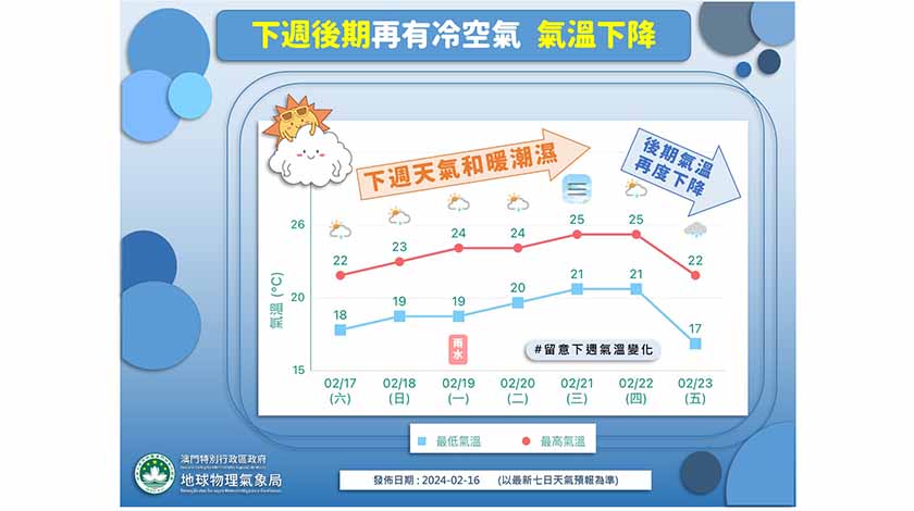 展望下周後期的天氣,將有另一股東北季風抵達華南沿岸,屆時本澳的氣溫將再度逐步下降。由於冬末春初的天氣較常乍暖還寒,氣象局提醒市民多留意天氣變化,適時增減衣物,及時關注局方的最新天氣資訊。