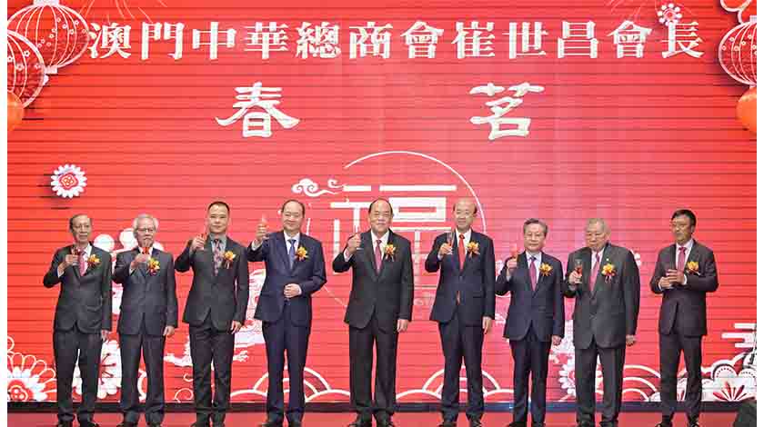 澳門中華總商會昨假萬豪軒舉行甲辰年春茗,邀請中聯辦主任鄭新聰、外交公署特派員劉顯法、駐澳部隊副司令員劉勁松、立法會主席高開賢、終審法院院長岑浩輝,以及行政法務司司長張永春、經濟財政司司長李偉農、社會文化司司長歐陽瑜、等嘉賓出席,與工商界一同歡慶春節 。