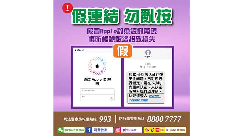 【特訊】近日司法警察局發現有騙徒再次假冒Apple公司,隨機向大量市民發送附有釣魚連結之短訊,內容訛稱市民帳號存在安全問題而被鎖定,需透過短訊內之連結登入並進行認證。
