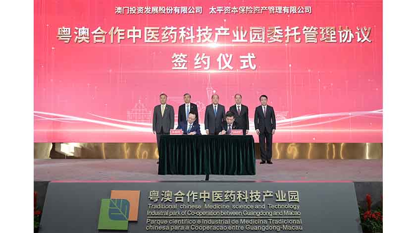 在澳門特別行政區行政長官、橫琴粵澳深度合作區管理委員會主任賀一誠,中央人民政府駐澳門特別行政區聯絡辦公室主任鄭新聰,中國太平保險集團董事長王思東,澳門特別行政區經濟財政司司長、橫琴粵澳深度合作區執行委員會主任李偉農和中國太平保險集團副總經理李可東見證下,由澳門投資發展股份有限公司主席吳建峰與太平資本保險資產管理有限公司總經理吳松代表雙方簽署《粵澳合作中醫藥科技產業園委託管理協議》,正式建立委託管理關係,共同推進產業園提升服務品質,加快產業聚集。