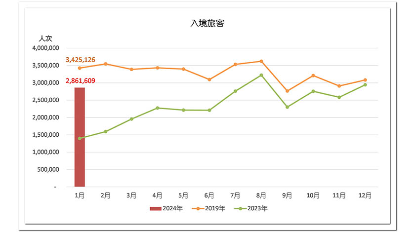 【特訊】統計暨普查局資料顯示,今年1月入境旅客按年增加1.0倍至2861609人次,恢復至2019年同期83.5%;與2023年12月比較則下跌2.8%。不過夜旅客(1480098人次)及留宿旅客(1381511人次)同比分別增加1.5倍及69.3%。旅客平均逗留時間為1.2日,按年縮短0.4日;留宿旅客的平均逗留時間(2.2日)減少0.4日,不過夜旅客(0.2日)亦縮短0.1日。