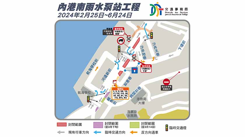 【本報訊】內港南雨水泵站及下水道工程進入施工高峰階段!為配合工程最新進展,政府將於本周日(廿五日)起再實施新一輪臨時交通措施,重點包括下環街出河邊新街路口將封閉為期四個月,直至六月下旬,車輛要改由沙井天巷駛出;鹹魚街出河邊新街路口也會同步完全封閉近廿天,至下月十四日重開。當局指交通壓力難免,冀駕駛者與行人保持耐性、互諒互讓、安全通行。