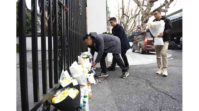 2月25日,市民前往娃哈哈集團原總部獻花。當日10時30分,娃哈哈集團創始人、董事長宗慶後因病醫治無效逝世,享年79歲。民眾前往位於浙江杭州清泰街的娃哈哈集團原總部敬獻鮮花寄哀思。 中新社