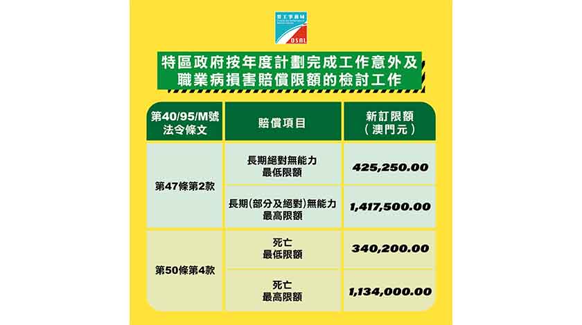 根據第40/95/M號法令《核准對工作意外及職業病所引致之損害之彌補之法律制度》的規定,對僱員因工作意外或職業病所引致的損害賠償的限額應每年作出分析,且在考慮社會發展狀況及通貨膨脹率,以及聽取勞工事務局及金融管理局的意見後,得以行政命令調整。按照年度計劃,特區政府已完成檢討有關賠償限額於2022年期間的實施情況。
