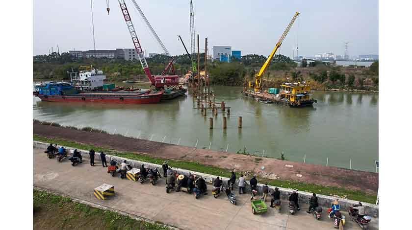 2月27日,廣東廣州,建設中的南沙三民島三民大道至中山民眾沙仔路保通鋼棧橋。2月22日,廣州南沙瀝心沙大橋被船隻撞擊,致橋面斷裂,當地靠大橋與島外連接的三民島民眾生活受到影響。為保障三民島民眾出行需求,目前,三民島三民大道至中山民眾沙仔路保通鋼棧橋正在有序建設中。 中新社