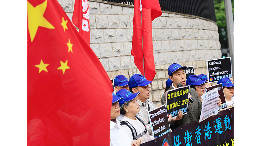 3月3日,“保衛香港運動”在美國駐港澳總領事館前強烈譴責美領事梅儒瑞抹黑第23條立法。(香港中通社)