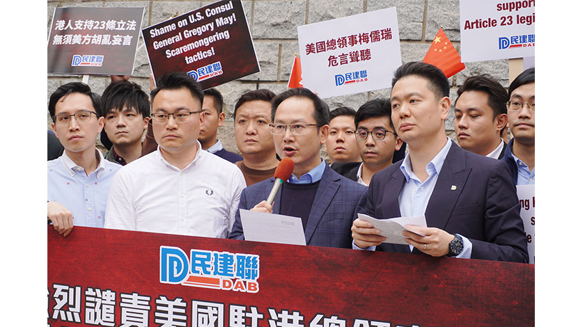 又訊:【香港中通社3月6日電】(記者 張明臻)美國政府官員妄議香港國安法和基本法第23條立法,不尊重香港司法制度。連日來,多批香港市民及團體到美國駐港總領事館前表達不滿。民建聯6日表示,港人支持23條立法,無需美方胡亂妄言;美方雙重標准,虛偽可恥。