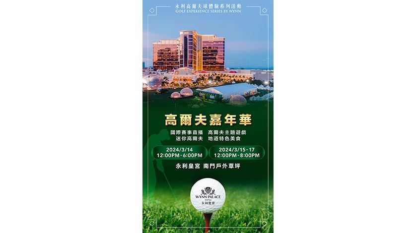 於 3 月 14 日中午 12 時至 6 時、3 月 15 至 17 日中午 12 時至晚上 8 時,永利皇宮南門戶外草坪的「高爾夫嘉年華」將設有豐富的高爾夫球主題遊戲包括適合家庭樂的入洞遊戲、讓熱愛高爾夫球運動的賓客一展身手的主題高爾夫球練習場和推杆練習場、新奇刺激的巨型泡泡球等免費活動。此外,賓客還可到南門戶外草坪及永利皇宮活動中心觀看賽事直播,品嚐永利與本地中小企 853 Burgers BomBoochKombucha 一起合作的美食攤位的各種美味輕食及選購由本澳專業高爾夫(澳門)有限公司展示的各類專業高爾夫球產品,盡享戶外休閒時光。夜幕降臨,於南門戶外草坪的大型發光高爾夫球裝置、炫幻迷宮及花田燈飾裝置為熱愛打卡的賓客留下美好回憶。賽事週期間,永利皇宮及永利澳門的如珠如包、咖啡苑;永利皇宮的甜藝廊、永利吧和永利澳門的霞酒廊及「炫」酒廊均會呈獻主題甜點及雞尾酒,永利澳門的湖畔意廊更會於 3 月14 至 17 日中午 12 時至 5 時上演賽事直播,賓客可品嚐特色主題餐點,一起融入高爾夫球運動的熱烈氛圍。