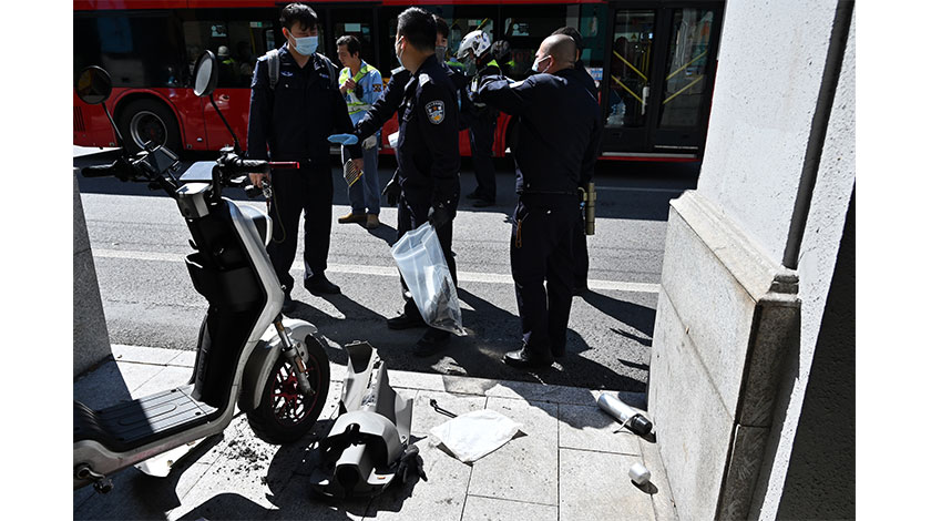 廣州市公安局交通警察支隊通報3月12日9時許,一輛小汽車先後在廣州市越秀區中山四路、廣仁路與行人和電動自行車發生碰撞,造成11人受傷。圖為工作人員在中山四路清理事故現場。中新社