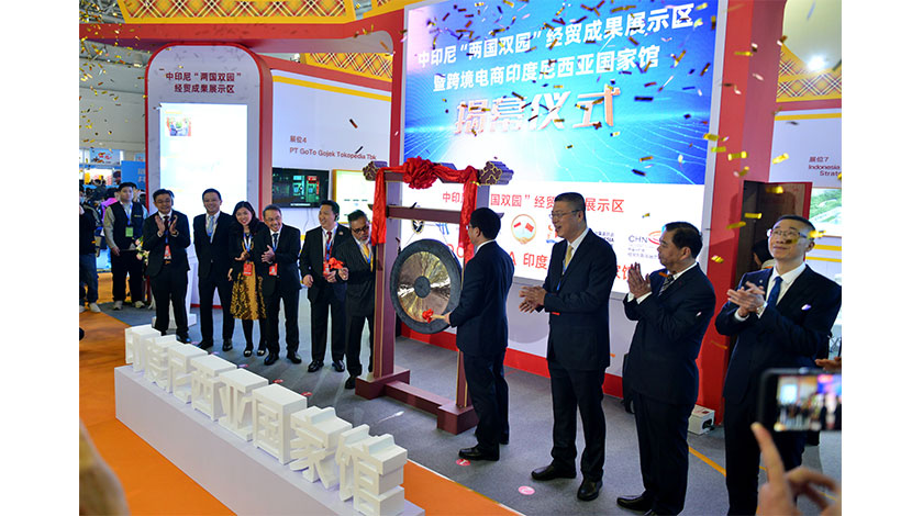 18日,展覽面積約5萬平方米的第四屆中國跨境電商交易會在福建福州啟幕。本次展會聚焦“鏈接跨境全流域 共建電商新生態”,展會面積約5萬平方米,吸引全球30多個跨境電商平台、中國80多個出口型產業帶和110多個城市的1500多家參展商參展。圖為中印尼“兩國雙園”經貿成果展示區暨跨境電商印度尼西亞國家館揭牌儀式。 中新社