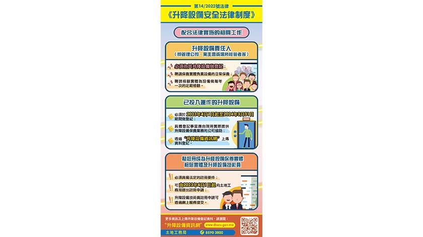 【特訊】第14/2022號法律《升降設備安全法律制度》將於2024年4月1日起正式實施。責任人須於3月31日或之前為已投入運作的升降設備作登記,包括可透過“升降設備資訊網”的網上服務功能隨時辦理。土地工務局呼籲責任人儘快完成升降設備的登記,以免影響設備使用。此外,按法律規定,原“安全運行證明書”可過渡至有效期屆滿。