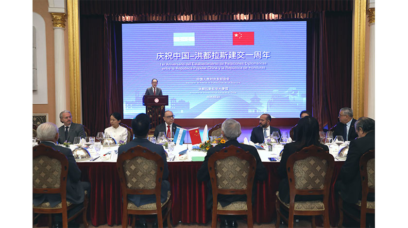 22日中國人民對外友好協會和洪都拉斯駐華使館在北京共同舉辦招待會,慶祝中國與洪都拉斯建交一周年。圖為中國人民對外友好協會秘書長沈昕致辭。 中新社