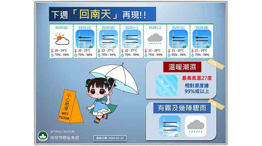 氣象局表示,過去數日,本澳受較乾燥的東北季風影響,陽光充沛,天氣相對清爽舒適。然而,春季限定的乾濕轉換模式將於今日開啓,按目前預測,廣東沿岸於周末期間逐漸轉受一股海洋性氣流影響,預料本澳下周再現「回南天」現象,天氣溫暖潮濕,早晚有薄霧或霧,偶有幾陣驟雨。