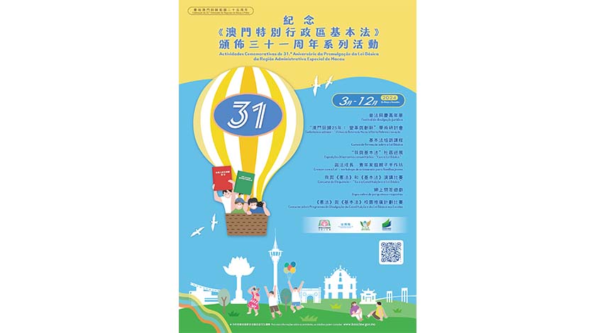 【特訊】為紀念《中華人民共和國澳門特別行政區基本法》頒佈三十一周年,澳門基本法推廣協會、法務局、市政署和教育及青年發展局將合辦研討會、嘉年華、圖片展、親子普法活動、演講比賽等系列活動,以持續逾九個月的多元跨媒體普法宣傳,加深社會各界對《澳門基本法》的瞭解,準確認識“一國兩制”方針,提升國家認同感。