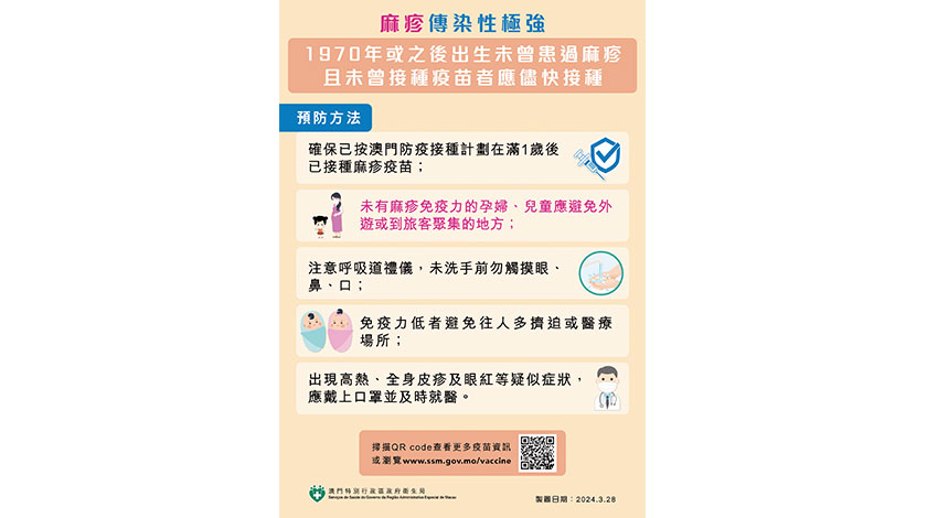 現時全球各地的麻疹流行有不同程度的上升,目前本澳雖不是麻疹流行地區,但隨著旅客訪澳及居民外遊數量增加,若本澳出現麻疹輸入個案,由輸入個案引起本地再傳播的風險將會增加。衛生局再次呼籲1970年或之後出生未曾患過麻疹且未曾接種疫苗的居民儘快完成麻疹疫苗接種,本澳居民及已獲准在本澳長期逗留的非澳門居民(如外僱、學生等)可透過預約(網址為https://www.ssm.gov.mo/mmrrs)在衛生中心或衛生站安排接種,非上述澳門居民及其他人士亦可自行到本澳私人醫療機構查詢接種事宜。
