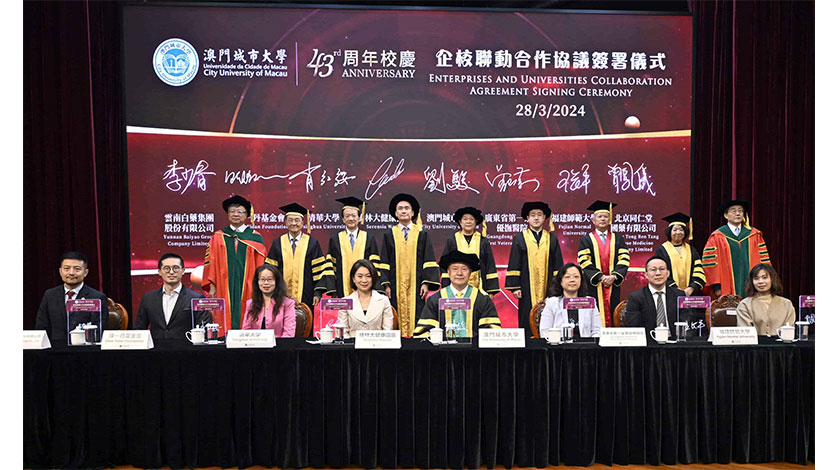 期間,城大舉行榮譽博士頒授典禮,由城大副校長周萬雷、葉桂平分別宣讀高福院士、高文院士讚辭,由陳明金校監和劉駿校長為兩位院士頒授榮譽理學博士學位,以表彰他們在各自領域取得的傑出成就,以及感謝他們對高等教育及社會發展的卓越貢獻。期間,城大亦舉行大健康學院揭幕儀式及企校聯動合作協議簽署儀式,與臻林大健康園區、廣東省第一榮軍優撫醫院、清華大學、福建師範大學、陳一丹基金會、北京同仁堂國藥有限公司、雲南白藥集團股份有限公司簽署合作協議,共同助力大健康產業建設,服務澳門“1+4”經濟適度多元發展。