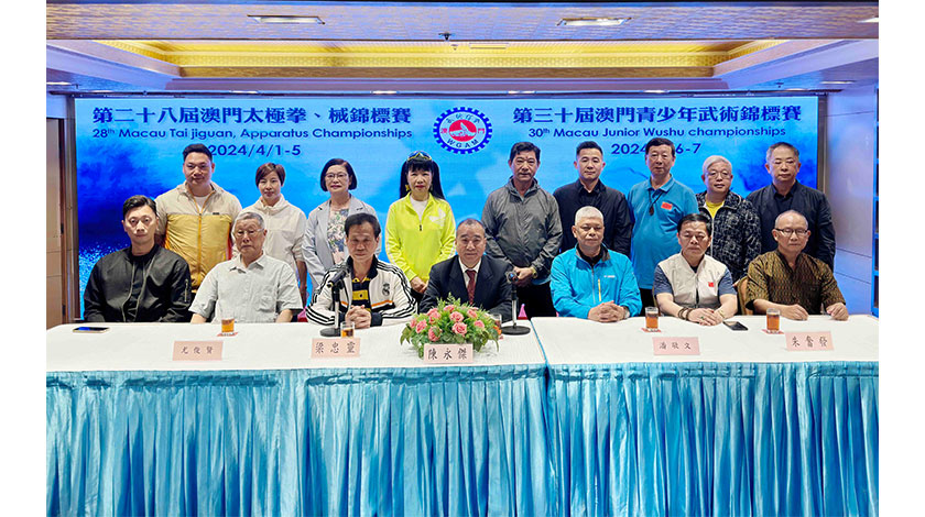澳門武術總會昨午在聯邦酒樓舉行新聞發布會,武術總會理事長陳永傑,副理事長潘敬文、朱奮發,尤俊賢,副理事長兼賽事執行委員梁忠靈等出席記者招待會。據介紹,今次兩個賽事的參賽隊伍共有41隊伍共有974名運動員參加報名人數不斷增加。太極賽於3日至7日(共5晚)舉行參賽隊伍共有31支。參賽運動員共有365人。賽事中設有初級組、老年組、青年組以及公開組四個組別。青少年賽共有參賽隊伍21支參賽運動員609人。