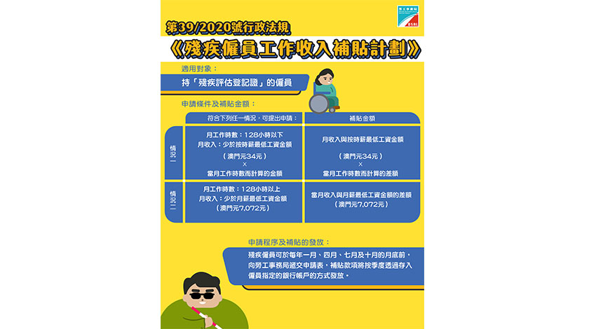 凡持有由社會工作局發出有效的殘疾評估登記證的本地僱員,如按月累計工作總時數少於128小時,且當月工作收入少於《僱員的最低工資》規定的每小時最低工資金額34澳門元乘以當月實際提供工作時數而計算的金額;又或符合按月累計工作總時數等於或多於128小時,且當月工作收入少於《僱員的最低工資》規定的每月最低工資金額7072澳門元,均可作出申請。