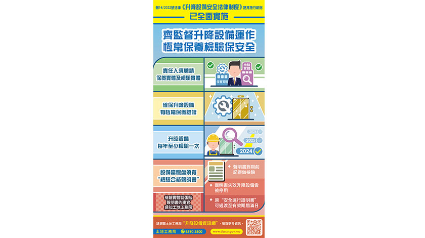 【特訊】第14/2022號法律《升降設備安全法律制度》及相關配套法規於4月1日起正式生效實施,為確保設備使用安全,責任人須聘請保養實體和檢驗實體負責設備的保養及檢驗工作。升降設備每年須至少進行一次檢驗,並將檢驗合格聲明書張貼設備當眼處。土地工務局呼籲使用者注意升降設備使用情況,如有問題應透過升降機內的聯絡資訊通知保養實體。
