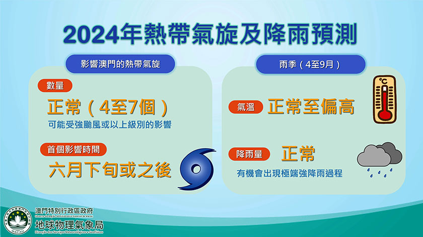 同時,在全球暖化的大趨勢下,預測今年雨季(4至9月)的平均氣溫屬正常至偏高,累積降雨量屬正常,並可能出現極端強降雨過程。