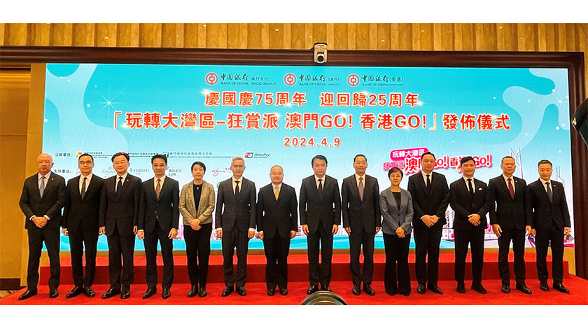 為助力粵港澳大灣區一體化建設,藉著今年為新中國成立七十五週年和澳門回歸祖國廿五週年的“雙慶”之年,澳門中銀與中銀香港在經科局、旅遊局和文化局的支持協辦下,與澳門六大綜合度假休閒企業、各大社團、商會、福隆新街歷史文化片區及眾多特色中小企聯手,推出慶國慶七十五周年迎回歸廿五周年「玩轉大灣區-狂賞派澳門Go!香港Go!」活動,昨早假中國銀行大廈多功能宴會廳舉行相關活動發佈會,邀請經濟財政司司長李偉農、澳門中聯辦經濟部部長劉德成、香港中聯辦經濟部副部長郭韶偉、經科局局長戴建業、旅遊局局長文綺華、文化局局長梁惠敏、深合區執行委員會副主任蘇崑、深合區金融發展局副局長鮑偉春、中國銀行(澳門)股份有限公司總裁陳曉平、中銀香港副總裁陳文、銀聯國際香港分公司助理總經理李兆豐等嘉賓為該活動主持啟動儀式,多個參與是次活動的社團、商會和企業代表亦有到場參與。