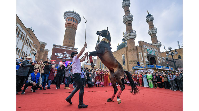 4月11日,新疆烏魯木齊,新疆國際大巴扎舉行開街儀式,汗血寶馬驚艶亮相併向遊客行禮致意,吸引民眾圍觀。圖為騎手指揮汗血寶馬進行馬術表演。 中新社