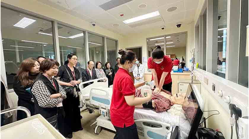 參觀過程中,鏡湖護院向中總代表團展示了為滿足現代護理教育需求而持續升級的教學設施,包括客觀結構化臨床考試中心於本年配置了視訊回饋暨中心管理系統,讓考試評核更客觀,提升專業技能考核的運作及管理效率和質量;模擬隔離病房、高仿真模擬教學設備和模擬長者家居環境場地,能訓練學生的綜合能力,提前接觸和適應臨床環境。代表團還參觀了由永利關愛基金會贊助的生命體驗館,加深了對護理專業及生命教育的認識。